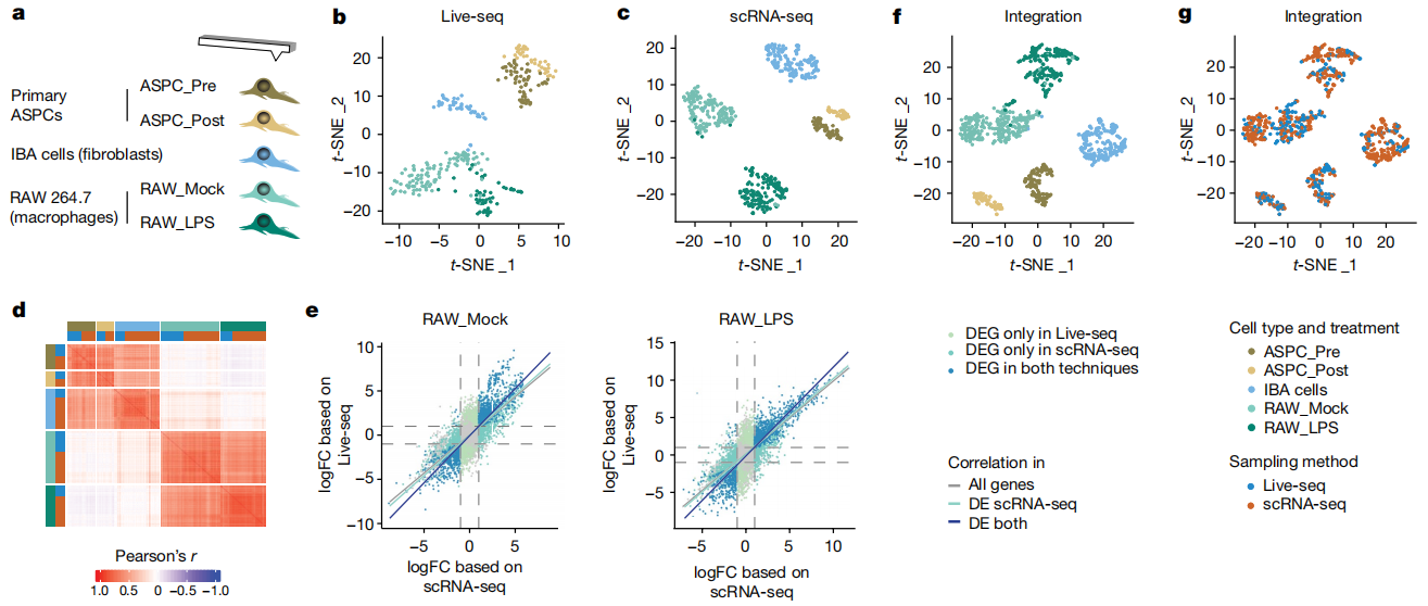 之后在了解到瑞士洛桑联邦理工学院研发了一种可以吸出部分胞质的特殊的原子力显微镜(FluidFM,原子力显微镜与微控流技术的结合),两个团队顺理成章的开始联合攻关。最终完成Live-seq的改造,对五种类型共295个细胞进行了测序,发现Live-seq能够有效区分不同类型的细胞,且平均每个细胞能检测到约4112个基因的表达信息。文章中所用的细胞包括IBA(神经胶质细胞)、ASPCs(原代小鼠脂肪干细胞和祖细胞)、RAW264.7(单核细胞或巨噬细胞样细胞系)、RAW-G9(红色荧光标记的Tnf启动子,便于下游功能分析)。