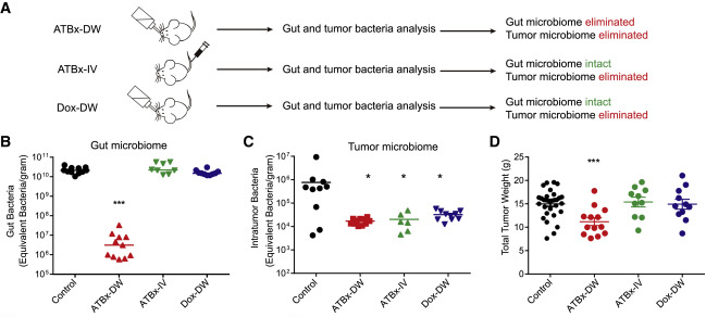 清除肿瘤内的微生物会阻碍肿瘤的转移,但不会阻碍原发肿瘤的生长通过测试不同的抗生素组合和给药途径来选择性地消除肿瘤驻留或肠道微生物群(图3A)。研究发现使用鸡尾酒抗生素(ATBx),通过饮用水(DW)可以有效清除肠道和肿瘤微生物菌群。当ATBx经尾静脉静脉注射时,肿瘤菌群被清除,而肠道菌群保持完整(图3B和3C)。通过DW给药穿透细胞膜的抗生素多西环素具有与ATBx-IV相似的效果(图3B和3C)。最重要的是,ATBx-IV和Dox-DW处理在肠道活菌数量、肠道微生物群谱和肿瘤免疫谱方面与对照组保持相当(图S3A S3D和S3F S3I)。结果发现ATBx-DW能有效地减缓自发MMTV-PyMT BTs的肿瘤生长(总肿瘤重量为15±对照组为0.5g,而ATBx-DW为11±0.8g),而单独用ATBx-IV或Dox-DW消除肿瘤微生物群并不影响肿瘤总重量(图3D)。这表明肠道菌群在肿瘤生长中起着重要作用,而肿瘤菌群则不然。